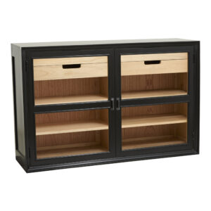 Utsida: gmelinaträ. Baksida: mindi-plywood och MDF. Hyllor: gmelinaträ.