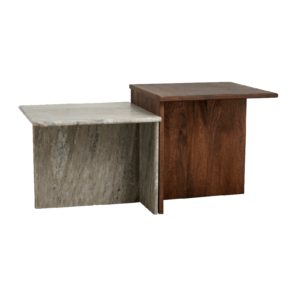 Det lilla bordet är tillverkat av marmor och det största bordet är tillverkat av mangoträ.